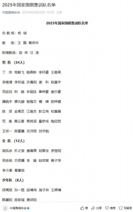 王星昊、丁浩等名將入選新一屆國(guó)家圍棋集訓(xùn)隊(duì) 柯潔未在其列