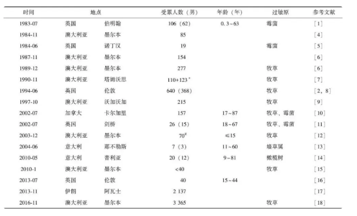 此后,陸續(xù)在全球范圍內(nèi)均有雷暴哮喘事件的相關(guān)報(bào)道,主要發(fā)生在英國、澳大利亞,另外加拿大、意大利、伊朗等國家也有類似報(bào)道。(下方表格中總結(jié)了自1983年以來文獻(xiàn)報(bào)道過的雷暴哮喘事件)