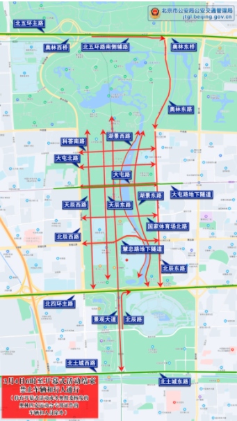一、6時(shí)至開幕式結(jié)束,慧忠路地下隧道、國家體育場北路、大屯北路、科薈南路、北五環(huán)路南側(cè)輔路(奧林西橋至奧林東橋)、天辰西路、景觀大道、天辰東路、湖景西路、湖景東路、奧林東路北向南方向主輔路、北辰東路北向南方向主輔路、北辰路南向北方向主輔路(民族園路至北辰橋),除持有開幕式或冬奧組委核發(fā)的奧林匹克運(yùn)動會專用證件的車輛和人員外,禁止其他車輛和行人通行。社會車輛和公交車可經(jīng)大屯路地下隧道、北四環(huán)路、北五環(huán)路主路及北側(cè)輔路、北土城西路、北土城東路繞行。