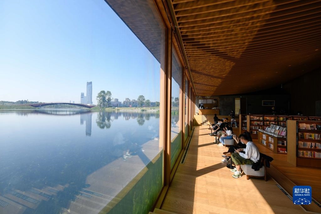 讀者在成都興隆湖畔的中信書(shū)店內(nèi)讀書(shū)(4月20日攝)。新華社記者 胥冰潔 攝